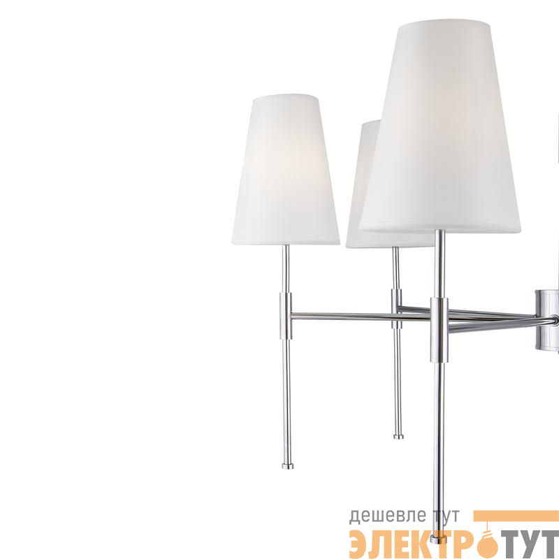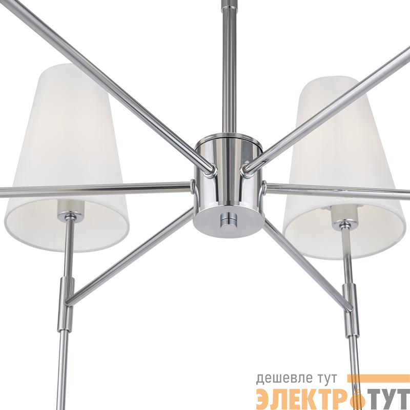 Материал арматуры – металл. Оттенки: хром, комбинация черного и латуни. Абажуры – белая ткань. Акцентный вытянутый силуэт. Источник света – лампа с цоколем E14.