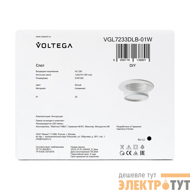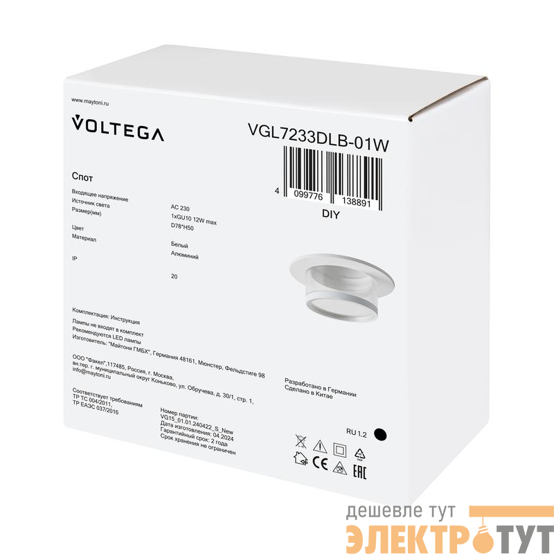 VGL7233DLB-01W | Светильник 233 10Вт GU10х1 IP20 спот Voltega