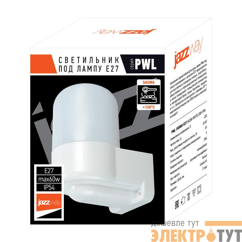 5061873 | Светильник PWL 155085 SAUNA WHITE E27 IP54 230В термостойкий для саун бел. JazzWay