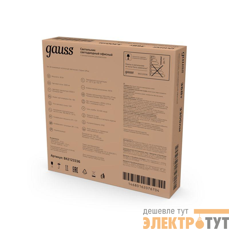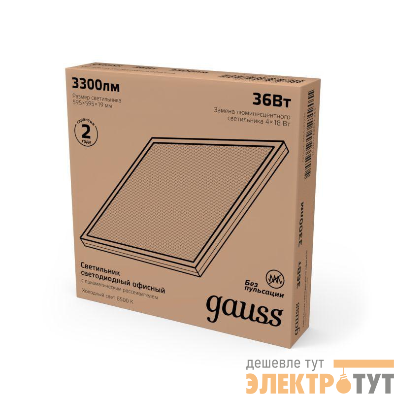 842123336 | Светильник светодиодный Офис 36Вт 6500К IP20 3200лм 595х595х19мм ДВО офисный рассеив. призма GAUSS