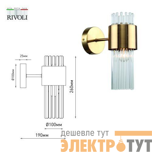 Бра настенное в цвете французское золото, с цилиндрическим плафоном из прозрачных стеклянных трубочек. Источник света для данного бра – лампа Е14 40 Вт (приобретается отдельно). Светильник настенный Rivoli Donna (арт. 3149-401) создаёт яркое дополнительное освещение. Размеры бра: 190*100*260 мм. К данному светильнику настенному можно купить люстры аналогичного дизайна: арт. 3149-305 – под 5 ламп, арт. 3149-307 – под 7 ламп. Коллекцию дополняет светильник подвесной – арт. 3149-201.