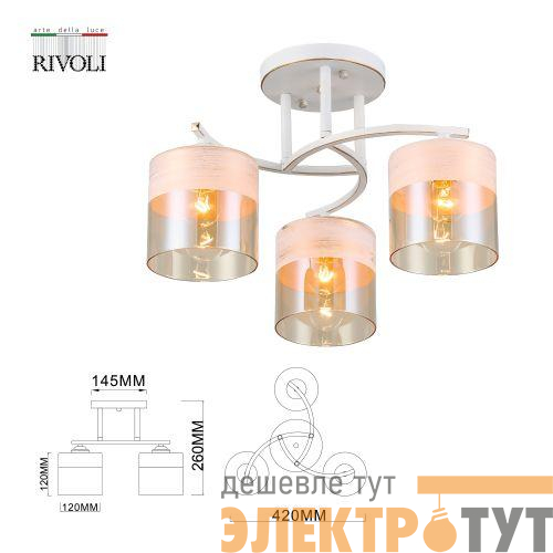 Rivoli Constancia (арт. 9081-303) - светлая дизайнерская люстра на потолок из металла и стекла. Бело-золотой корпус люстры окрашен в технике декоративного состаривания - удачное решение для создания стиля прованс и в целом уюта в доме. Плафоны с теплым золотистым тонированием имеют белый ободок в верхней части. Количество плафонов - 3. Они мягко рассеивают свет и качественно освещают площадь 9 м2. Арматура люстры аккуратная, с плавными линиями. Люстры потолочные Constancia от итальянского бренда Rivoli формируют в доме спокойное умиротворенное настроение.