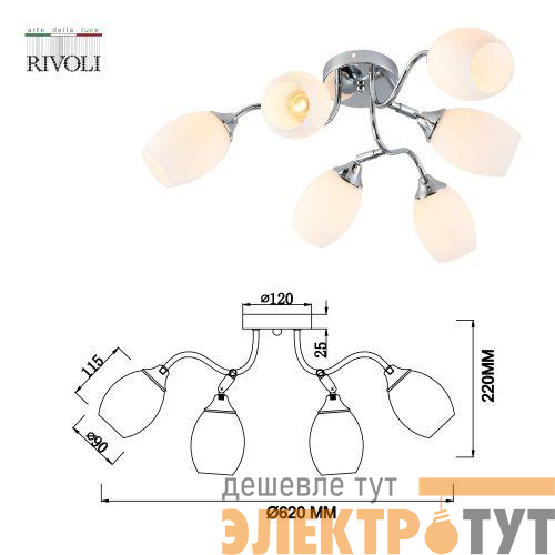 Rivoli Hollie (арт. 3135-306) - 6-рожковая светлая люстра на потолок, выполненная в стиле модерн. Габариты люстры: 620*620*220 мм. В коллекции итальянских дизайнеров Rivoli Hollie представлены аналогичные люстры потолочные с 8 плафонами - арт. 3135-308.