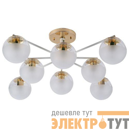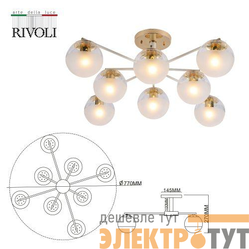 Umbra Rivoli (арт. 3129-308) - современная люстра в стиле модерн, люстра в гостиную в бело-золотой гамме. Количество плафонов - 8 (люстры с 8 плафонами / люстры под 8 ламп). Круглые компактные плафоны поделены на 2 части - прозрачный верх и матовый низ. Матовое стекло люстры отлично рассеивает свет и устраняет блики, прозрачное обеспечивает отличную подсветку потолка, делая комнату визуально просторнее и светлее. Находиться в комнате, где установлены люстры потолочные Umbra от европейского бренда Rivoli, приятно комфортно. Света этой люстры хватает для качественного освещения площади до 24 м2.