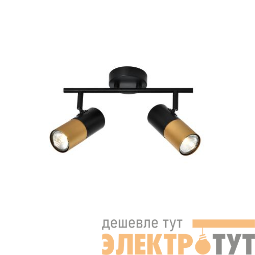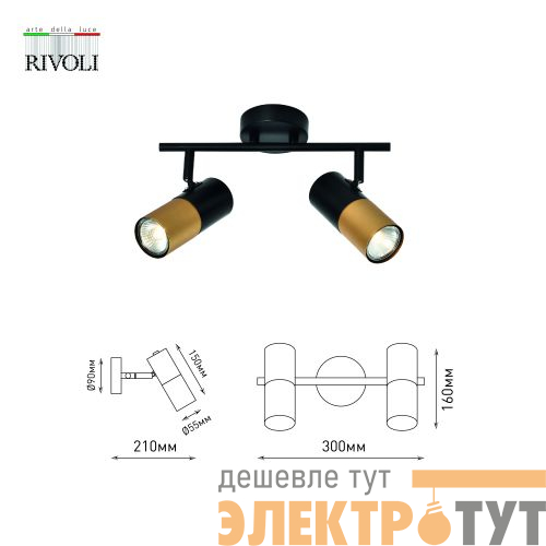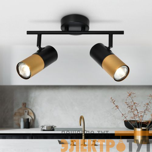 Спот поворотный Rivoli Belladonna под 2 лампы эффектно смотрится в современных интерьерах. Это отличный вариант для организации дополнительного освещения в спальне, в гостиной, в кабинете, на кухне. Двухцветные (чёрный + золотой) плафоны расположены на лаконичной металлической рейке чёрного цвета.