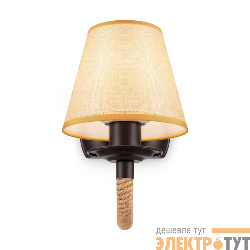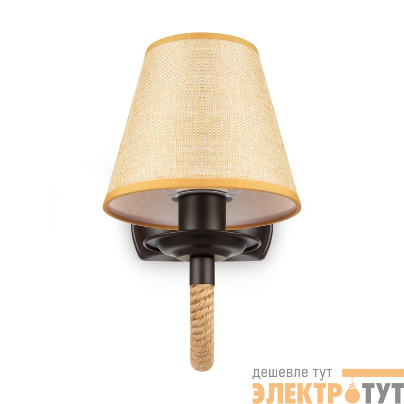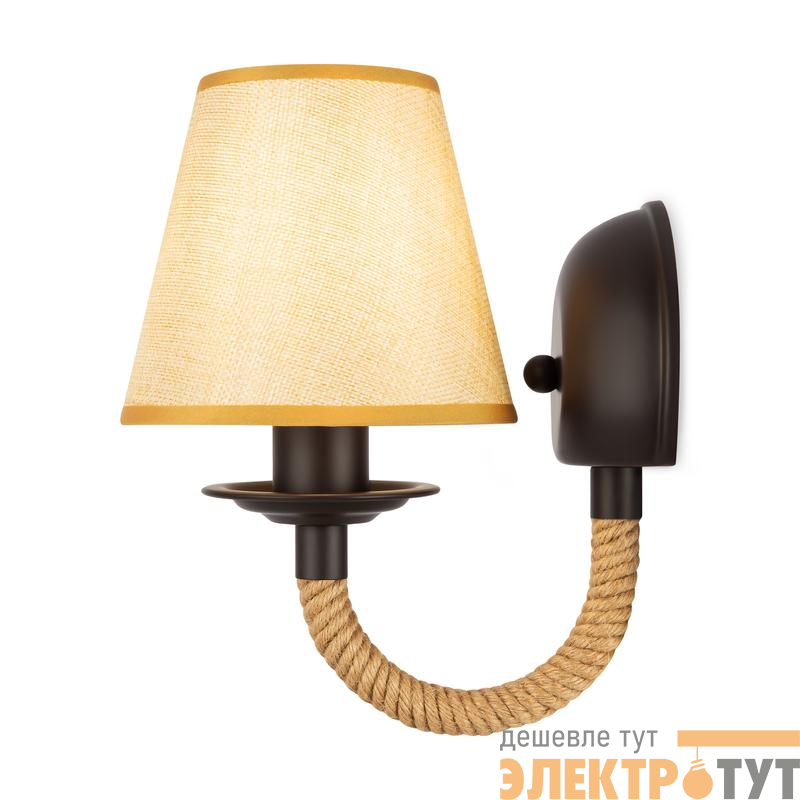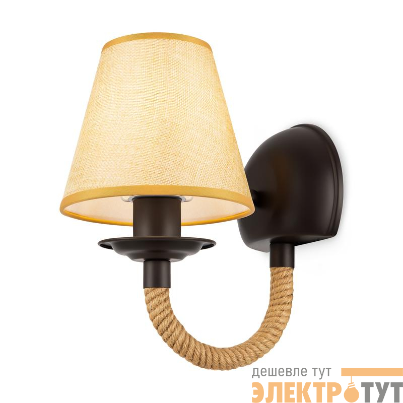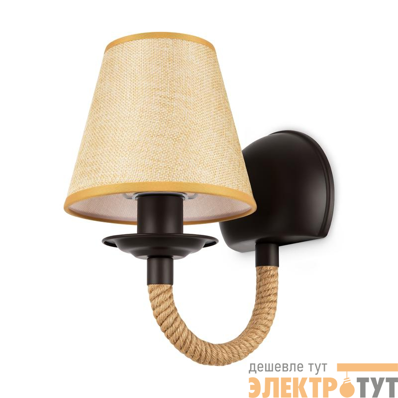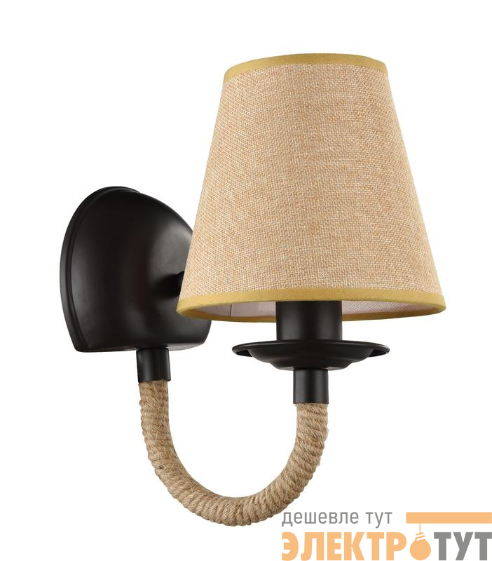 Серия светильников создана под влиянием основных принципов эко-дизайна, с использованием натуральных материалов для предметов интерьера. Арматура люстры из матового черного металла с легким золотым патинированием гармонично сочетается с абажурами из холщовой натуральной ткани. Рожки и центральная часть люстры плотно обвиты холщовой веревкой. Окантовка на верхней и нижней части абажура желто-песочного цвета.