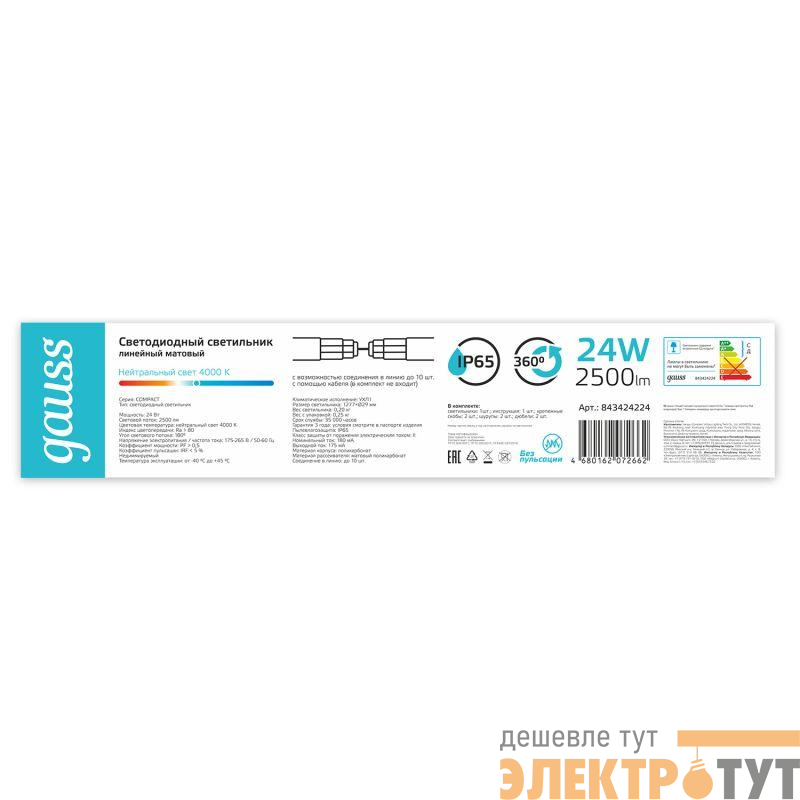 843424224 | Светильник светодиодный 1277х29х29мм 24Вт 4000К 2500лм IP65 COMPACT линейный матов. соед. в линию до 10шт GAUSS