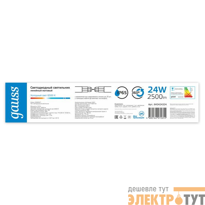 843424324 | Светильник светодиодный 1277х29х29мм 24Вт 6500К 2500лм IP65 COMPACT линейный матов. соед. в линию до 10шт GAUSS