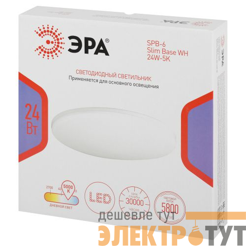 Светодиодный светильник ЭРА SPB-6 Slim Base WH 24W-5K – современное решение для общего освещения жилых и коммерческих помещений.