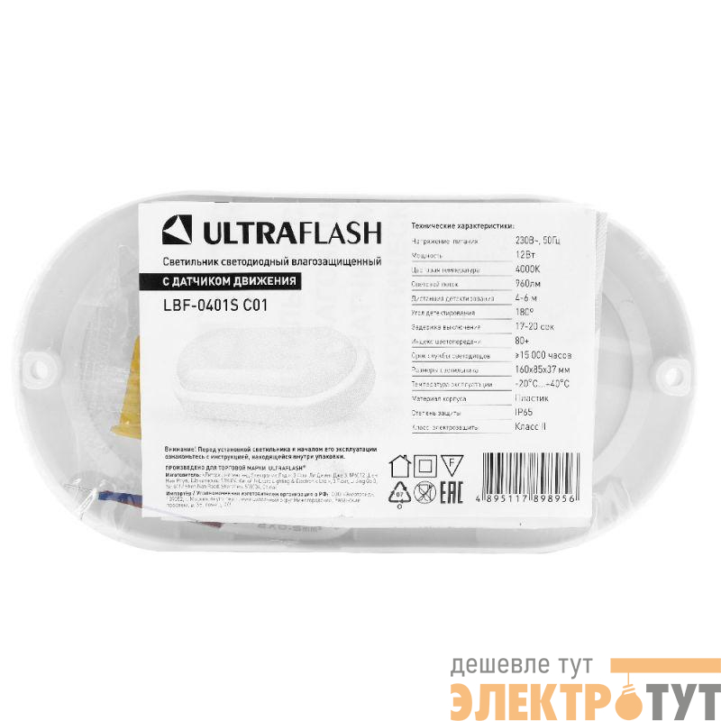 Ultraflash LBF-0401S C01 с датчиком движения, овал, мощность 12Вт, световой поток 960лм, цветовая температура 4000К, источник света - встроенные светодиоды, степень защиты IP65, размер 160*85*37мм, материал-пластик.