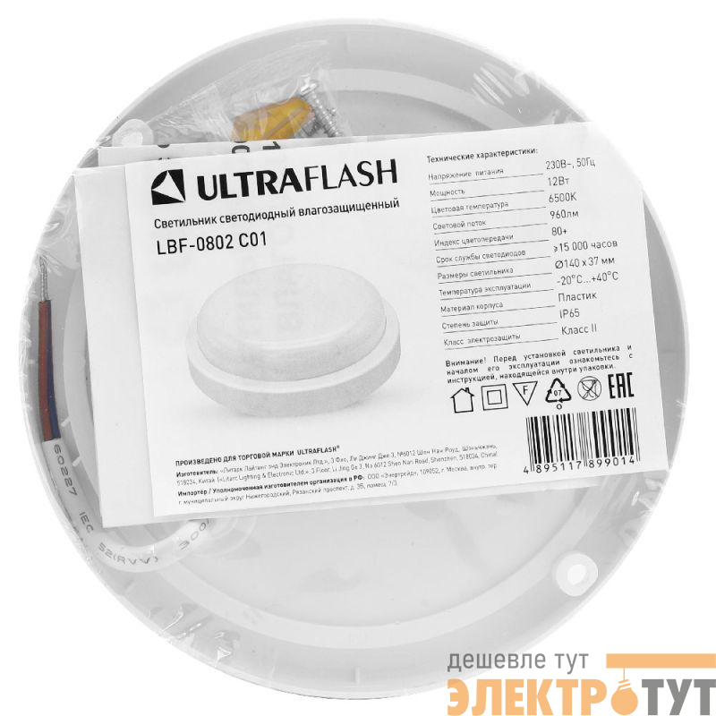 Ultraflash LBF-0802 C01, круг, мощность 12Вт, световой поток 960лм, цветовая температура 6500К, источник света - встроенные светодиоды, степень защиты IP65, размер 140*37мм, материал-пластик.