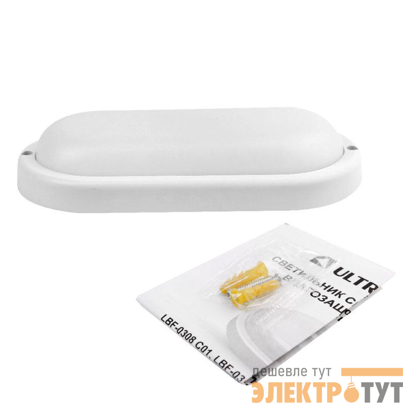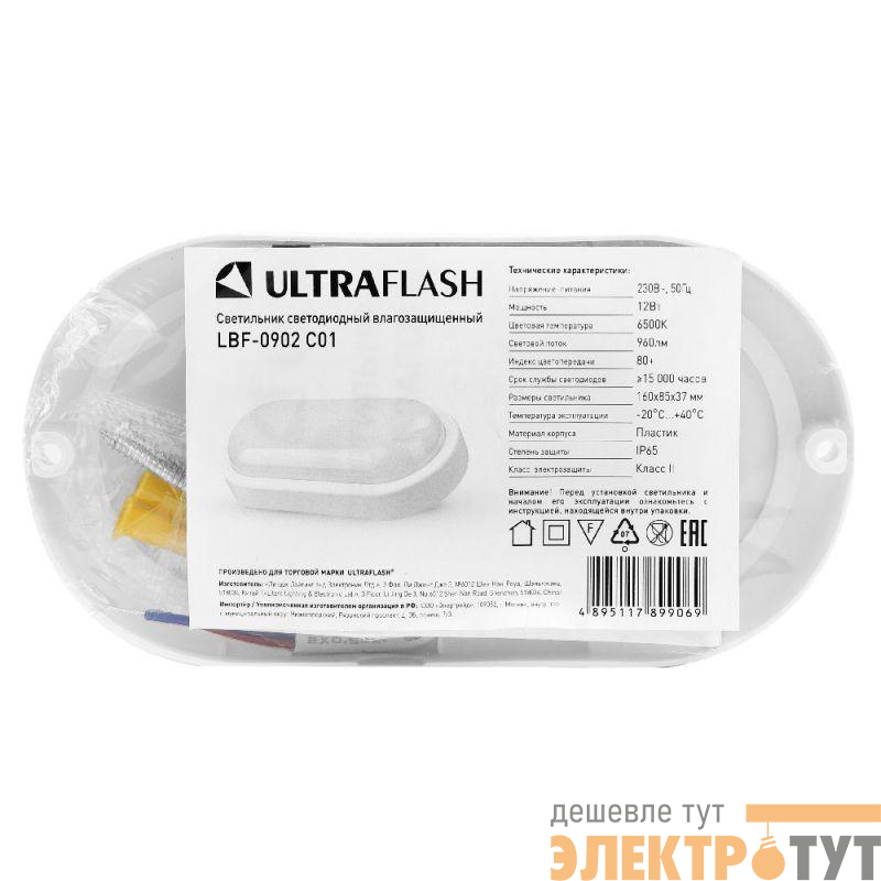 Ultraflash LBF-0902 C01, овал, мощность 12Вт, световой поток 960лм, цветовая температура 6500К, источник света - встроенные светодиоды, степень защиты IP65, размер 160*85*37мм, материал-пластик.