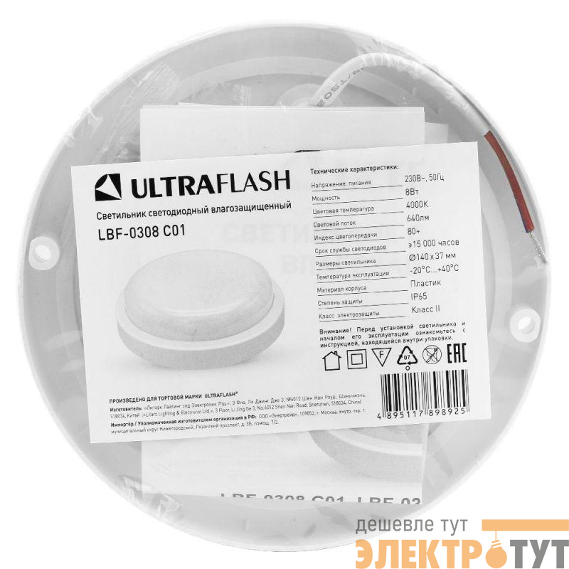 Ultraflash LBF-0308 C01, круг, мощность 8Вт, световой поток 640лм, цветовая температура 4000К, источник света - встроенные светодиоды, степень защиты IP65, размер 140*37мм, материал-пластик.