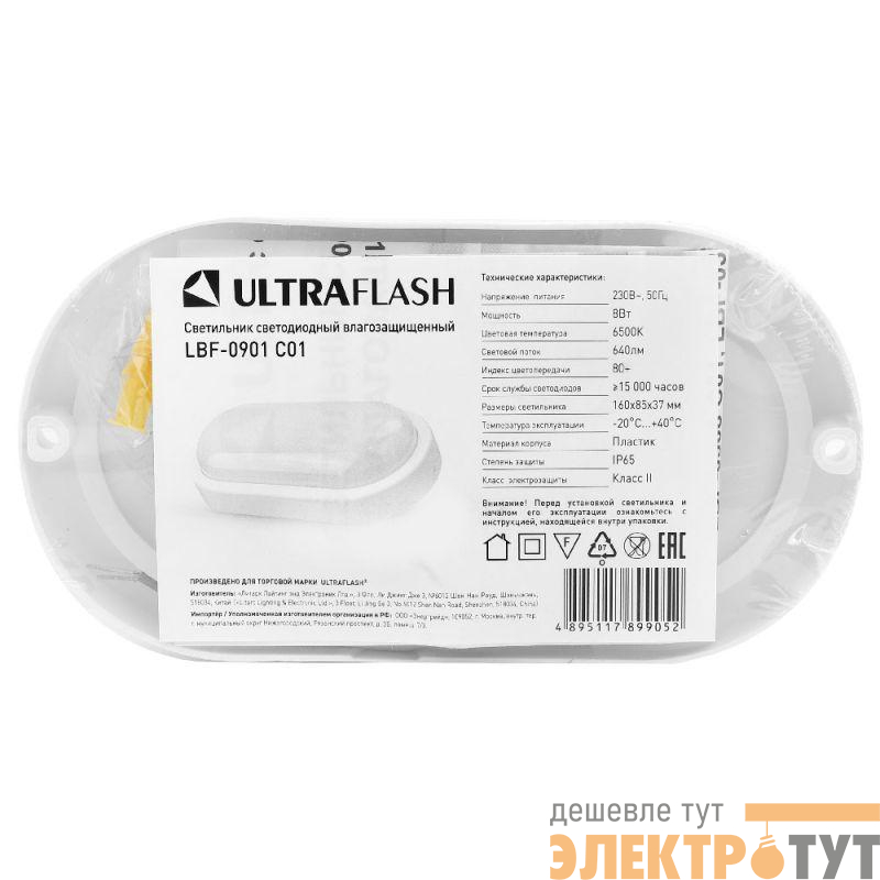 Ultraflash LBF-0901 C01, овал, мощность 8Вт, световой поток 640лм, цветовая температура 6500К, источник света - встроенные светодиоды, степень защиты IP65, размер 160*85*37мм, материал-пластик.