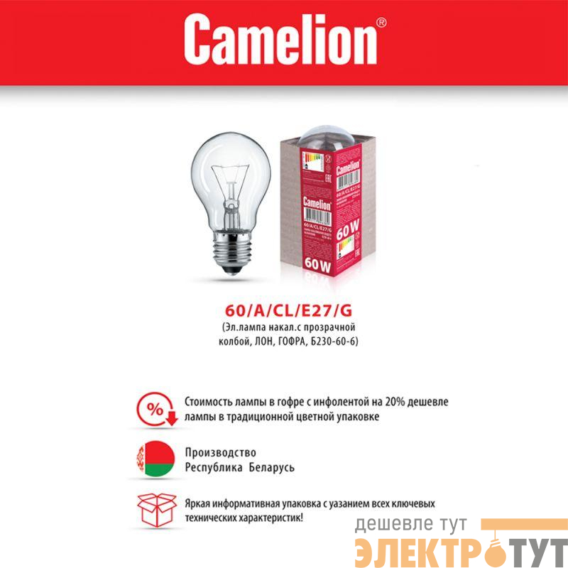 15042 | Лампа электрич. накаливания 60/A/CL/E27/G с прозр. колбой ЛОН ГОФРА Б230-60-6 Camelion