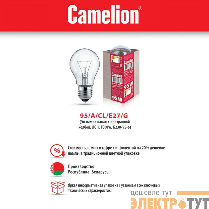 15043 | Лампа электрич. накаливания 95/A/CL/E27/G с прозр. колбой ЛОН ГОФРА Б230-95-6 Camelion