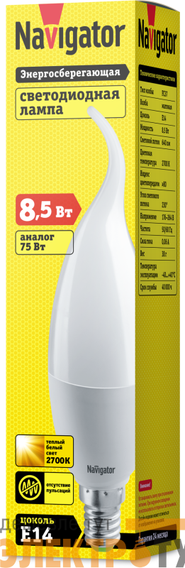 61330 | Лампа светодиодная 61 330 NLL-FC37-8.5-230-2.7К-E14-FR 8.5Вт свеча на ветру 2700К тепл. бел. E14 640лм 176-264В Navigator