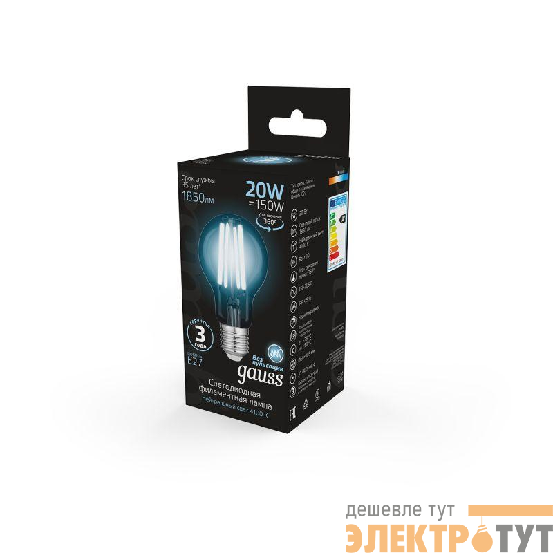102902220 | Лампа светодиодная филаментная Black Filament 20Вт A60 грушевидная 4100К нейтр. бел. E27 1850лм GAUSS