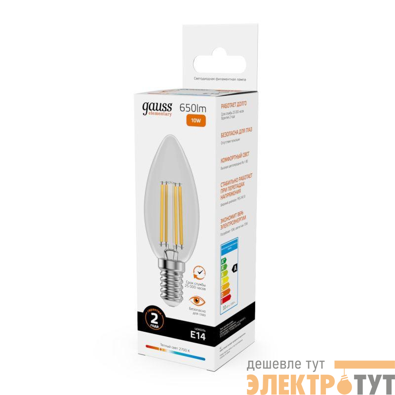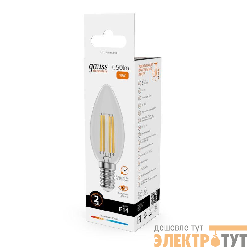 32110 | Лампа светодиодная филаментная Filament Elementary 10Вт свеча 2700К Е14 650лм GAUSS