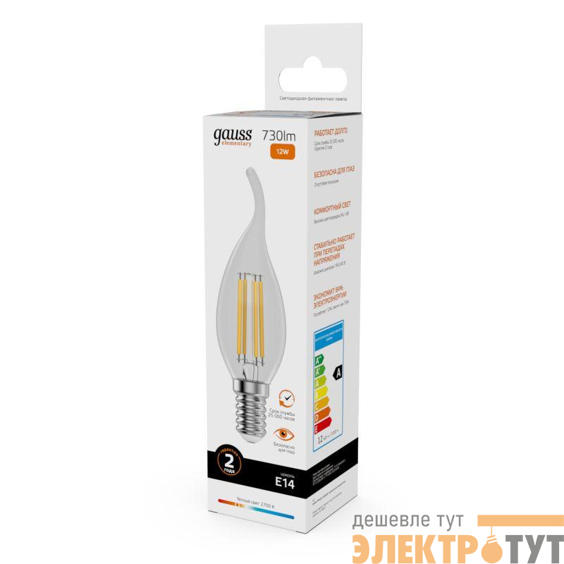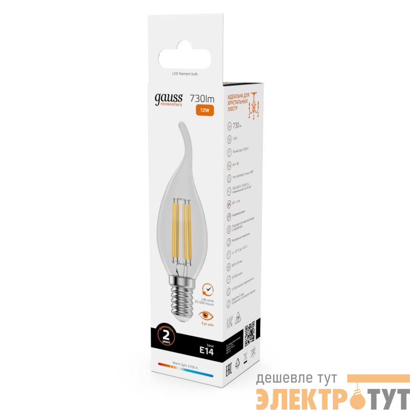 42112 | Лампа светодиодная филаментная Filament Elementary 12Вт свеча на ветру 2700К Е14 730лм GAUSS