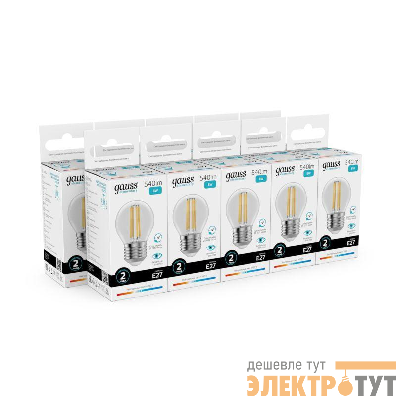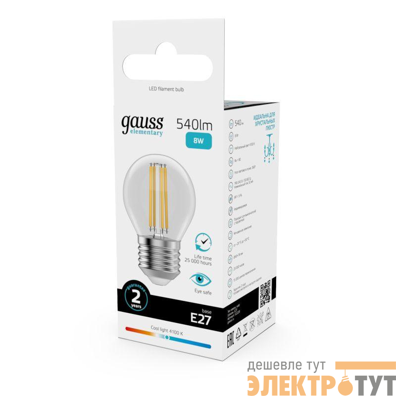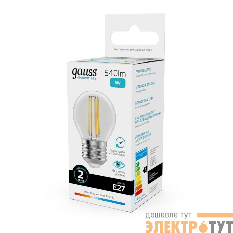 52228 | Лампа светодиодная филаментная Filament Elementary 8Вт шар 4100К Е27 540лм GAUSS