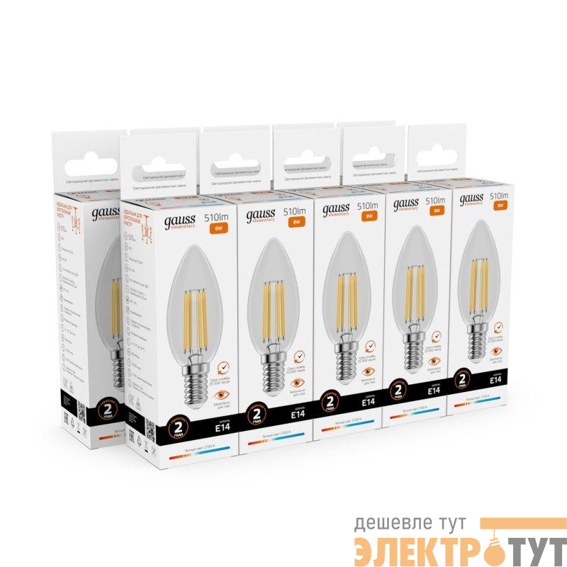 32118 | Лампа светодиодная филаментная Filament Elementary 8Вт свеча 2700К Е14 510лм GAUSS