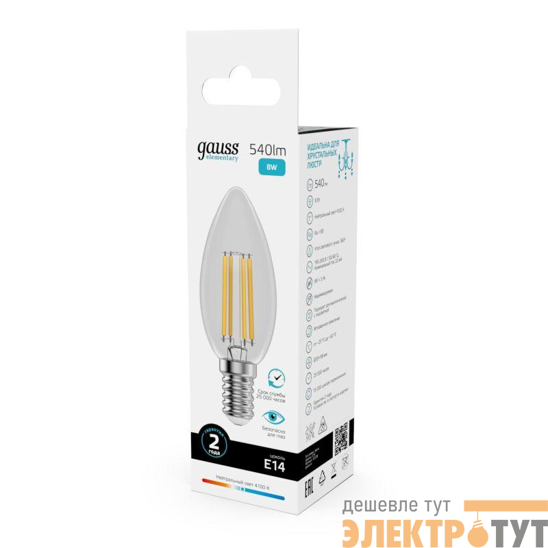 32128 | Лампа светодиодная филаментная Filament Elementary 8Вт свеча 4100К Е14 540лм GAUSS