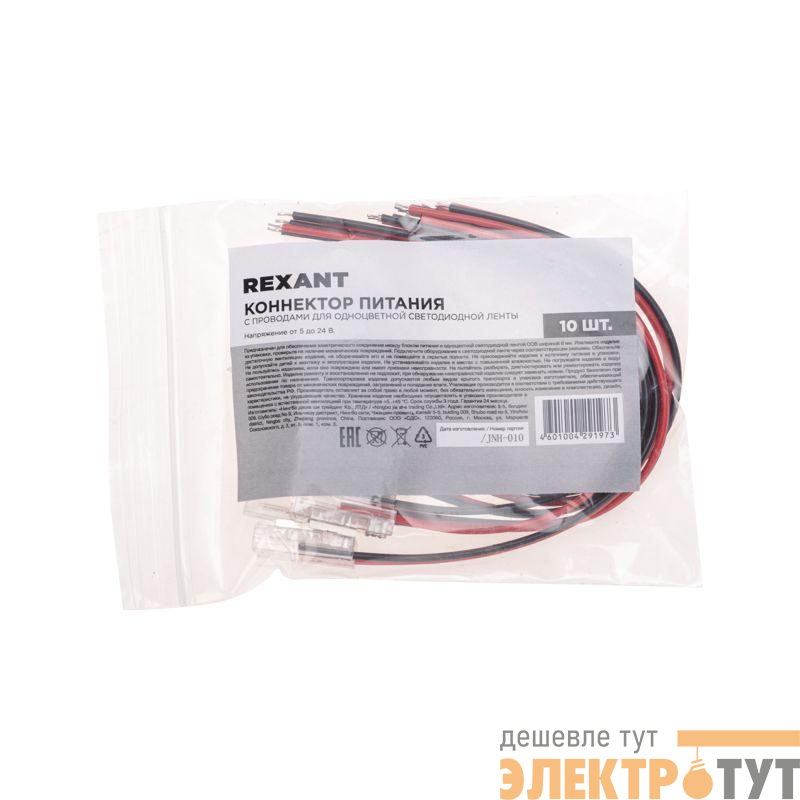 148-101 | Коннектор питания с проводами для одноцветной светодиодной ленты COB 8мм Rexant