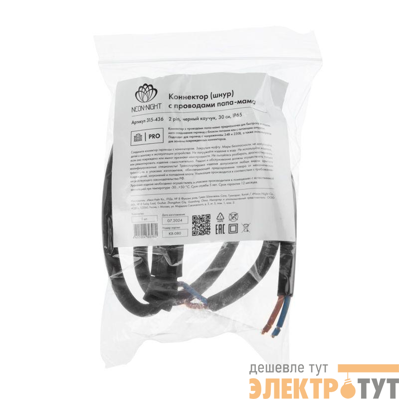 315-436 | Коннектор с проводами папа-мама 2 pin черн. каучук Neon-Night