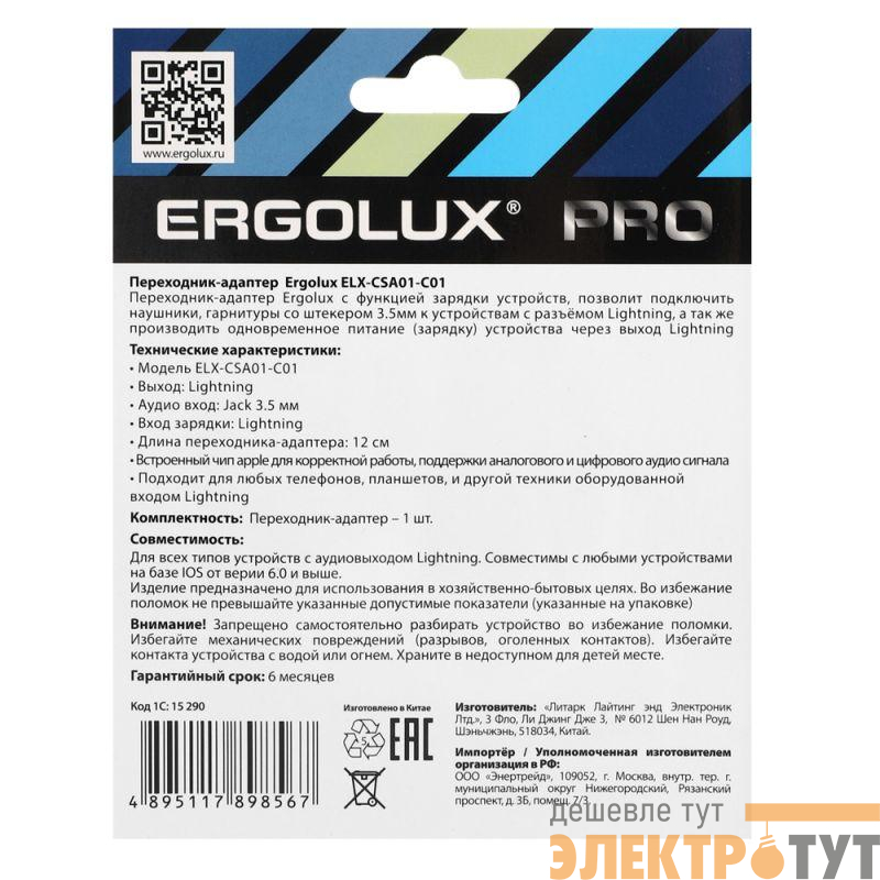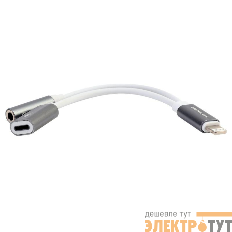 15290 | Адаптер звук+зарядка ELX-CSA01-C01 Lightning 2 Lightning-3.5мм 8см блистер бел. ERGOLUX