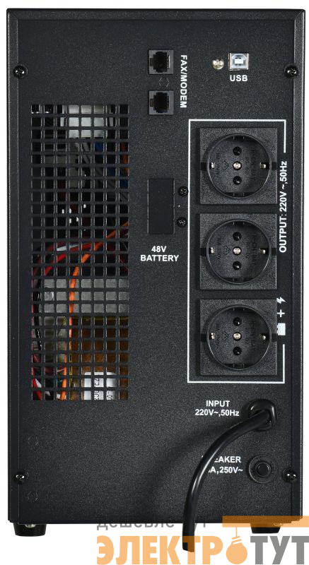 ИБП оснащен 3 разъемами SCHUKO и USB разъемом. ИБП имеет встроенный АКБ 4 шт емкостью 7Ач.