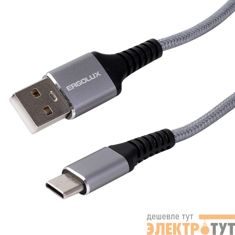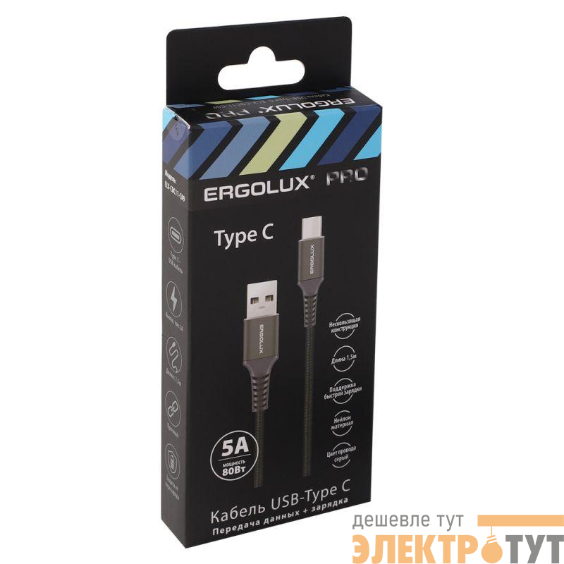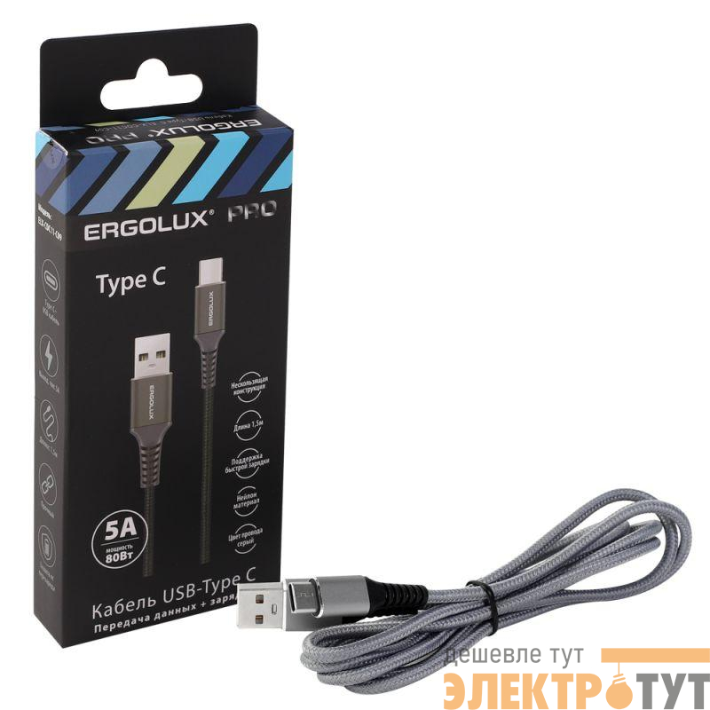 15312 | Кабель USB-Type C ELX-CDC11-C09 5А 80Вт 1.5м сер. нейлон зарядка+ПД коробка Ergolux