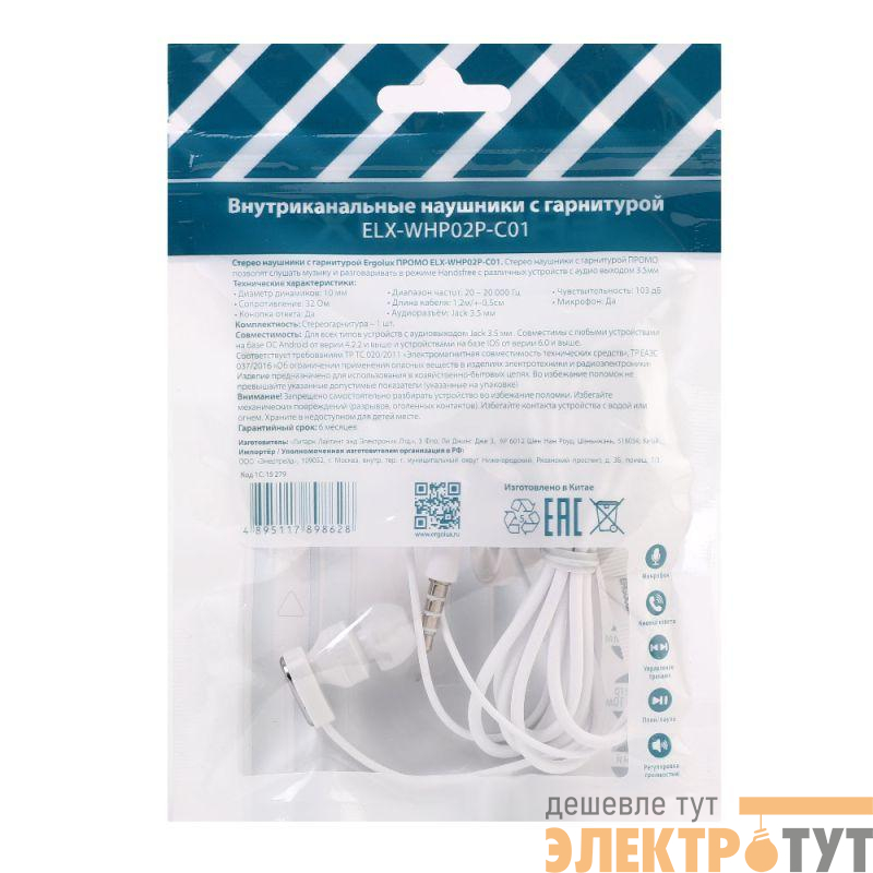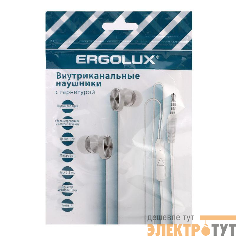 15279 | Наушники вакумные с микрофоном проводные ELX-WHP02P-C01 ПРОМО 3.5мм 1.2м пакет бел. Ergolux