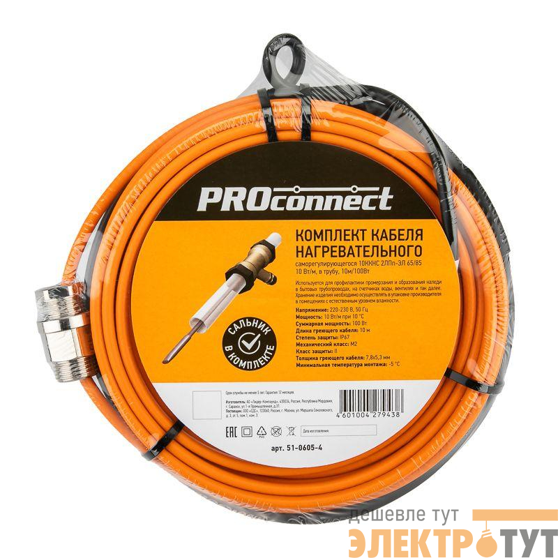 51-0605-4 | Кабель греющий саморег. 10 ККНС 2ЛПп-ЭЛ 65/85 в трубу 10м/100Вт PROconnect