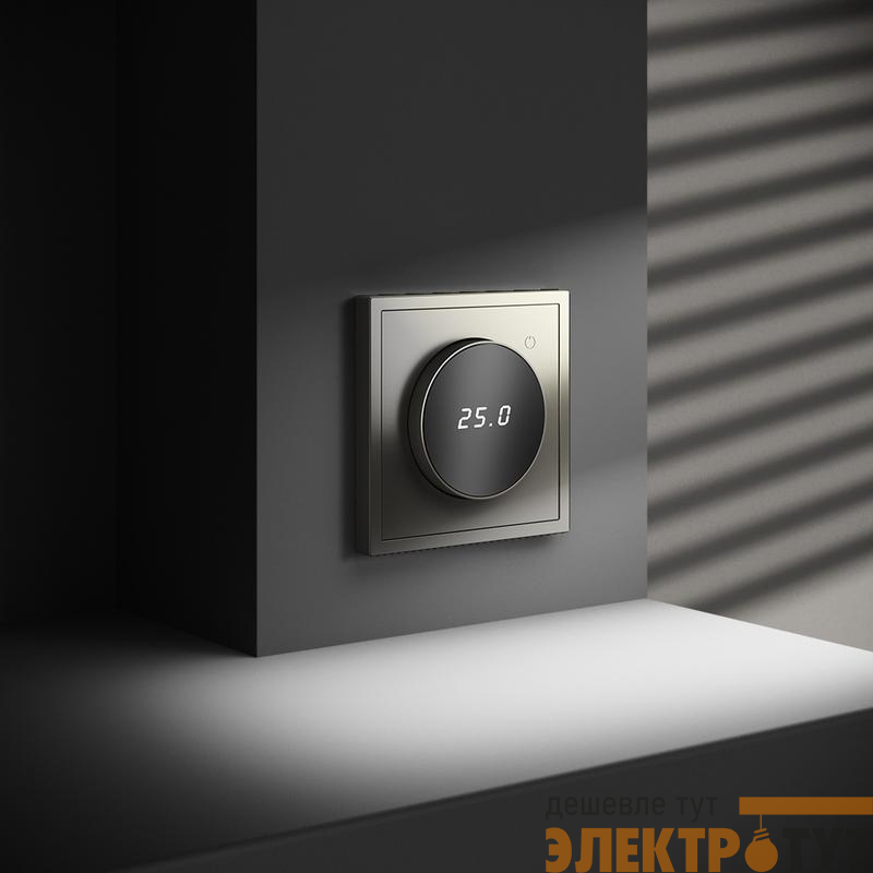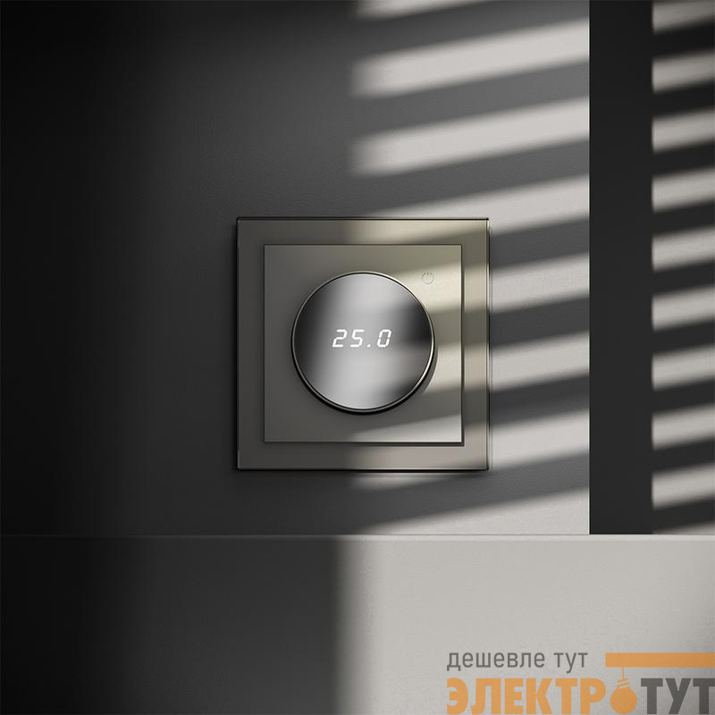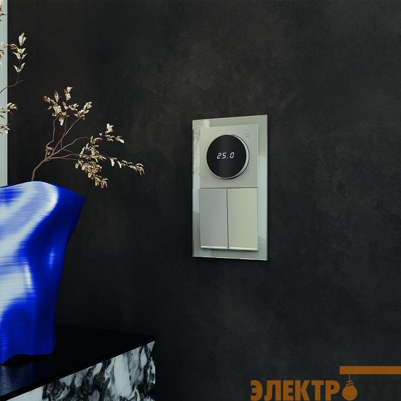 Место установки. Терморегуляторы Voltum предназначены для регулирования температуры теплого пола. Актуальны как в городских квартирах, так и в загородных дачных домах без центрального отопления. Корпус. Дизайн терморегуляторов Voltum сочетается со стилем остальных электрических устройств компании. Они совместимы со всеми рамками. Материал внешних декоративных элементов — поликарбонат. Конструктивные особенности. Терморегуляторы работают с любыми типами теплых полов и рассчитаны на нагрузку до 3500 Вт. Устройства оснащены светодиодной индикацией режима и дисплеем, на котором отображается температура поверхности пола. Красный индикатор — «подача питания на нагревательный кабель (идет процесс нагрева)», отсутствие индикации — «заданная температура достигнута». В течение 15 минут после нагрева терморегулятор переходит в интеллектуальный «спящий режим», уменьшая яркость подсветки цифр и сокращая энергопотребление. Регулировка осуществляется вращением панели управления. Терморегулятор поставляется в комплекте с механизмом из пластиковой накладки и датчиком температуры.