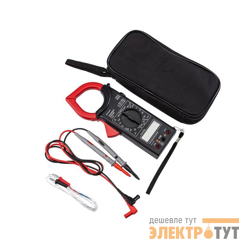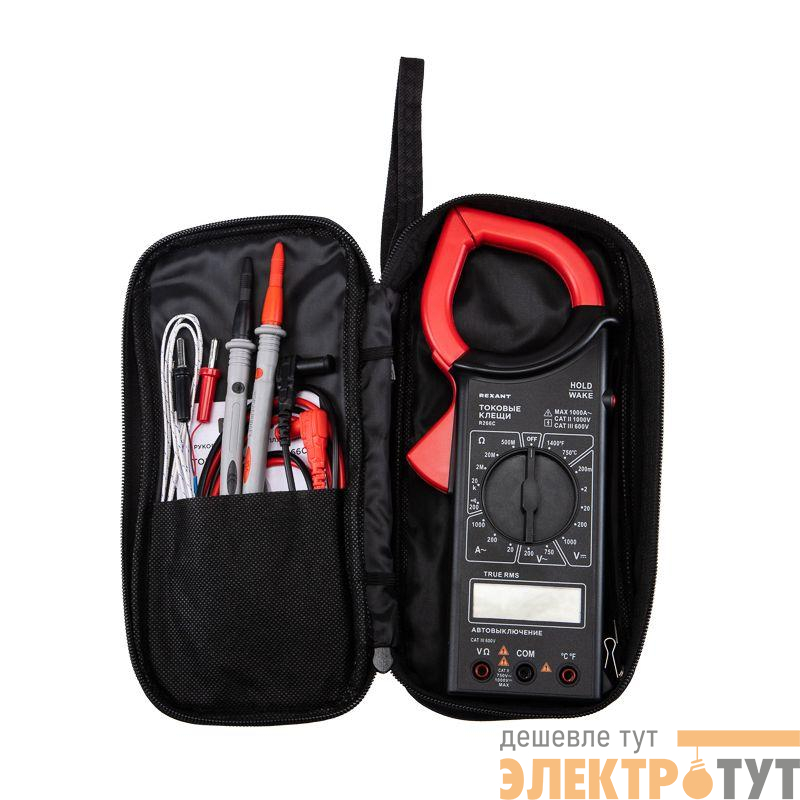 В комплекте: токовые клещи, измерительные щупы, термопара, чехол, батарея, инструкция