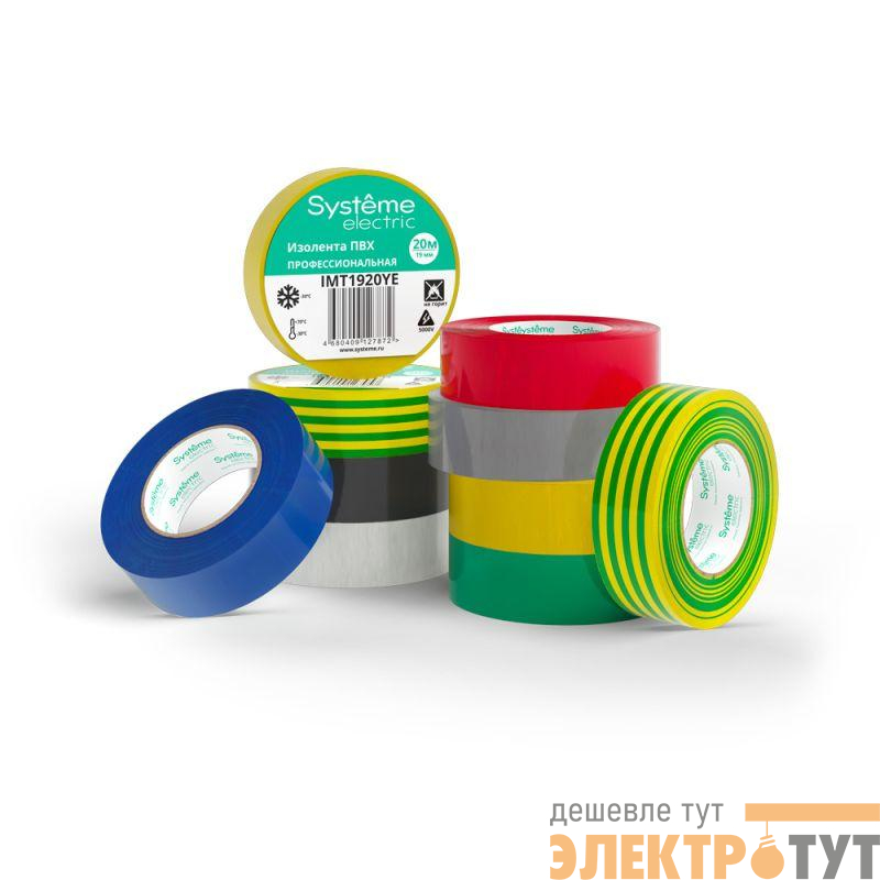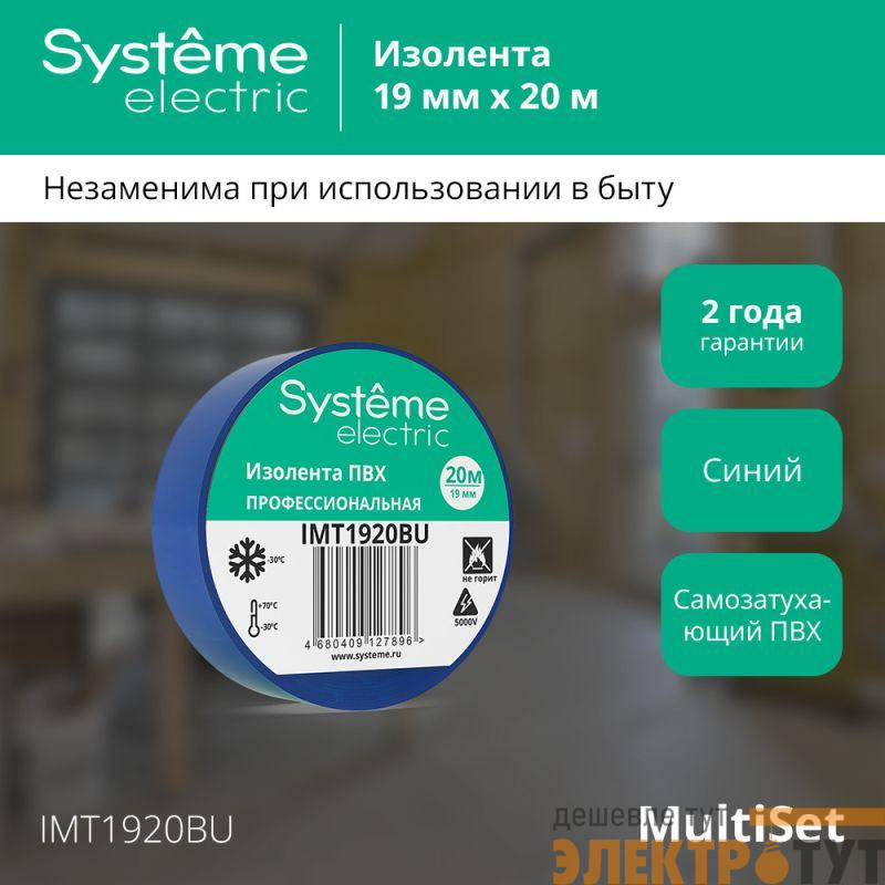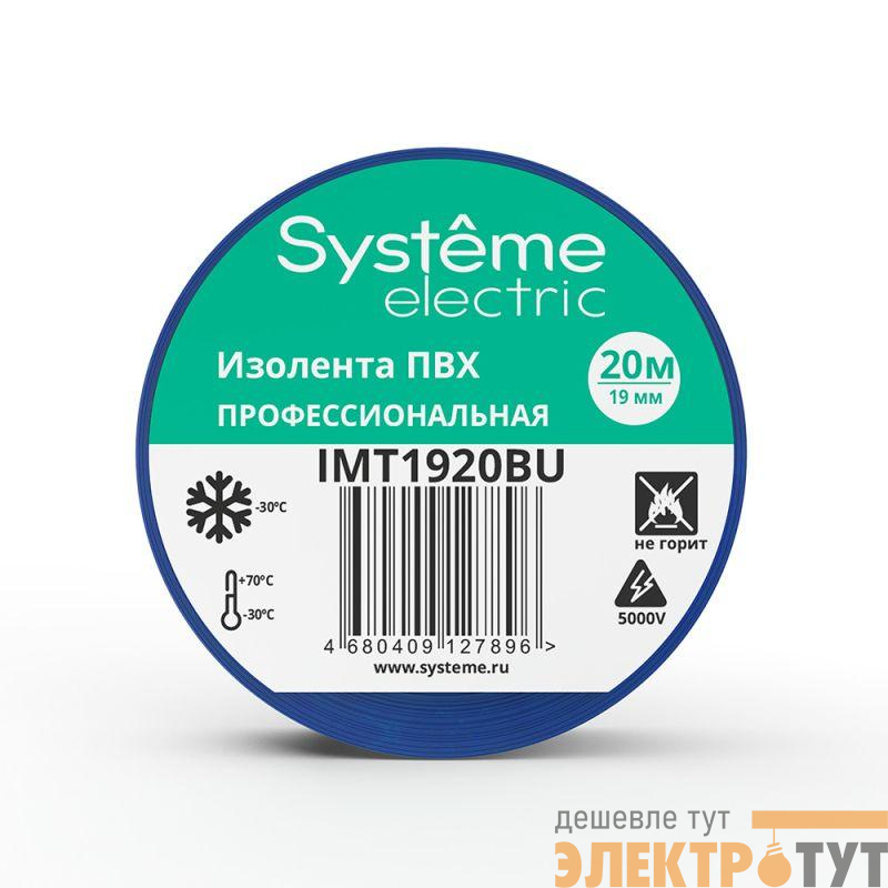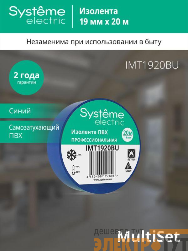 Изолента Systeme Electric серии MultiSet в синем цвете предназначена для изоляции электрических соединений и проводов.
