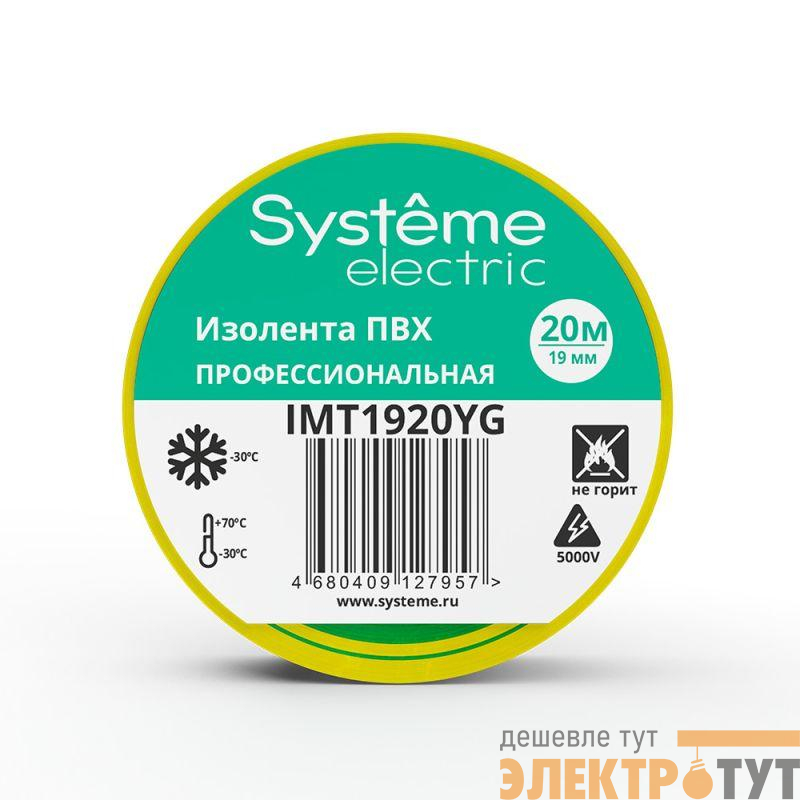Изолента Systeme Electric серии MultiSet в желто-зеленом цвете предназначена для изоляции электрических соединений и проводов.