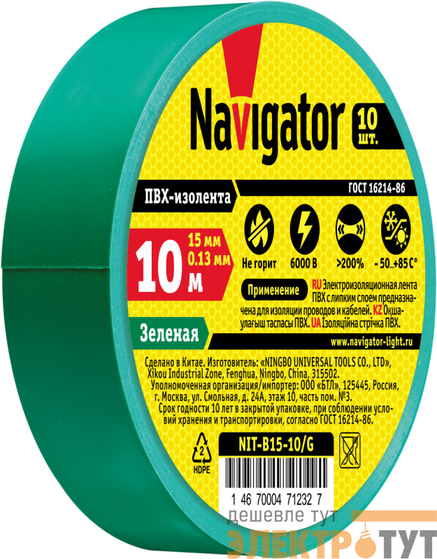 71232 | Изолента ПВХ 15мм (рул.10м) зел. NIT-B15-10/G Navigator
