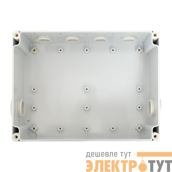 Корпус и крышка выполнены из поликарбоната, фиксируются межу собой винтами из нержавеющей стали. Пыле- и влагозащиту обеспечивает уплотнитель, выполненный из неопрена. Соединительные коробки комплектуется двумя кабельными вводами М20 и одним М25 из полиамида, имеющими степень защиты IP68. Неиспользуемые отверстия закрываются заглушками соответствующего диаметра (входят в комплект). Материал изготовления заглушек – полиамид.