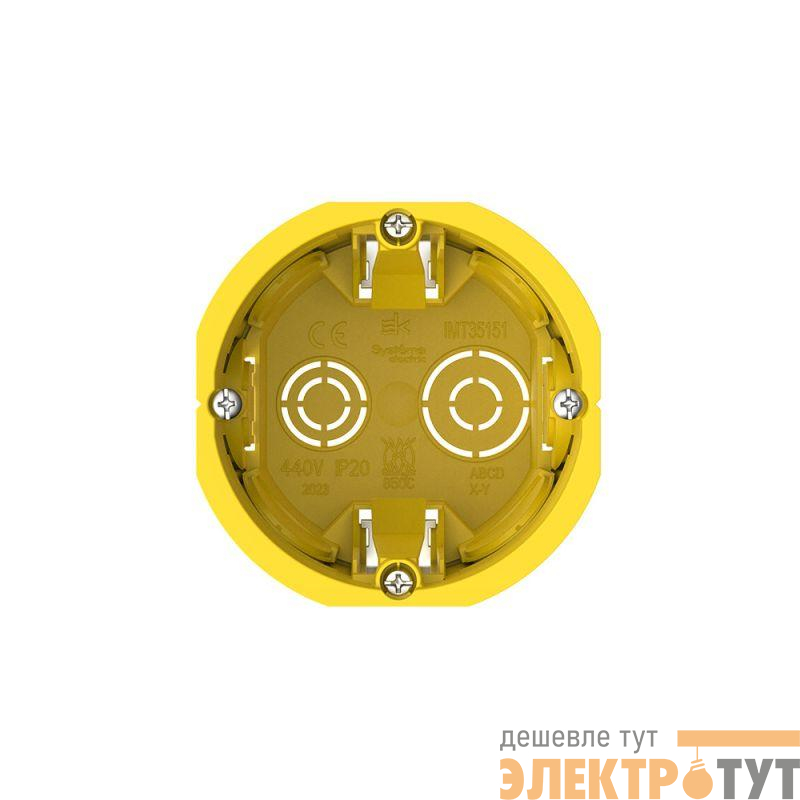 Монтажные коробки Systeme Electric (ранее Schneider Electric) используются для установки в полые стены. ЭУИ крепятся винтами, входящими в комплект. Имеют металлические лапки, трёхзаходные винты с обжимкой на концах, и отверстия D10, D16, D20 мм для ввода кабеля/гофротрубы. Соединяются в группы соединителем IMT35180, обеспечивая 71 мм между центрами коробок. Внутренние размеры - D65x60 мм, под коронку D68 мм. Степень защиты – IP20, огнестойкость – 850 °С. Материал: полипропилен.