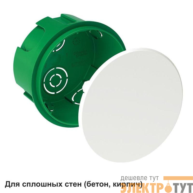 Распределительные коробки Systeme Electric (ранее Schneider Electric) используются для установки в сплошные стены, например, из кирпича, бетона, пенобетона. Имеют намеченные отверстия диаметром 10, 16, 20 мм для ввода кабеля или гофротрубы. Укомплектованы защёлкивающейся белой крышкой диаметром 80 мм. Внутренние размеры - D70x40 мм, размеры нишы для монтажа - D80x41 мм. Степень защиты – IP30, огнестойкость – 650 °С. Материал: полипропилен. Имеют индивидуальную этикетку.
