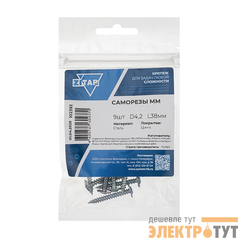 102392 | Саморез для тонкого метал. листа 4.2х38 (уп.9шт) пакет Tech-Krep