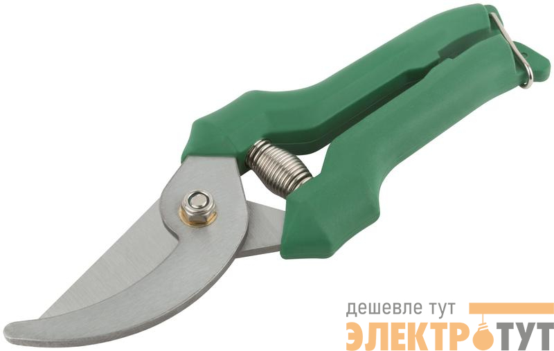 Секатор. С проволочной пружиной и скобойфиксатором. Режущие кромки внахлест. Для обрезания побегов и веток толщиной до 20 мм. Материал: лезвия из инструментальной стали, пластиковые ручки. Упаковка: блистер.