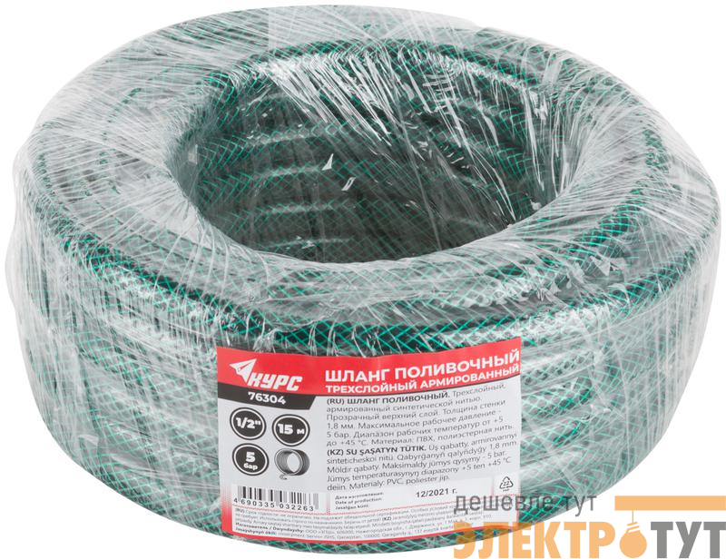 76304 | Шланг поливочный трехслойный армированный 1/2дюймх1.8ммх15м зел. КУРС
