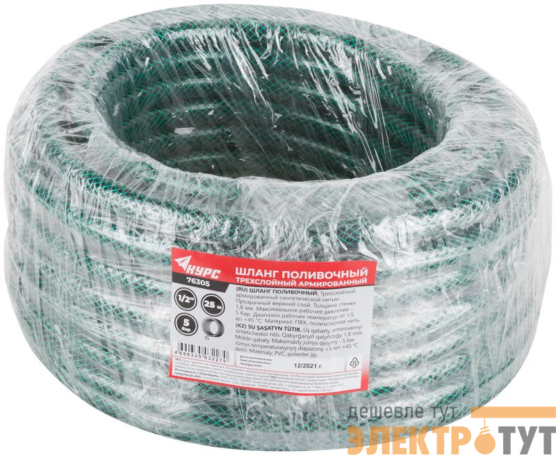76305 | Шланг поливочный трехслойный армированный 1/2дюймх1.8ммх25м зел. КУРС