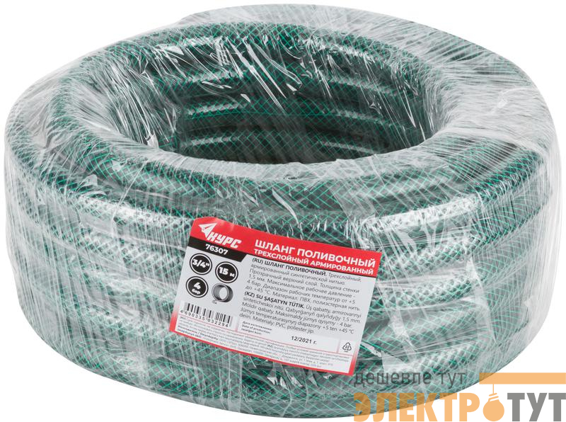 76307 | Шланг поливочный трехслойный армированный 3/4дюймх1.5ммх15м зел. КУРС