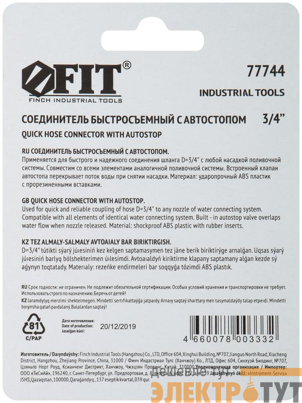 77744 | Соединитель двухкомпонентный с автостопом 3/4дюйм FIT