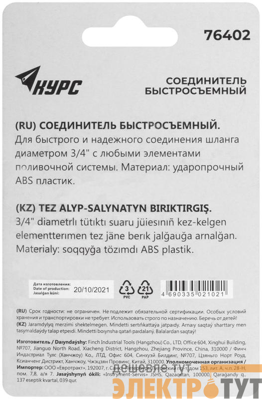 76402 | Соединитель пластиковый 3/4дюйм КУРС