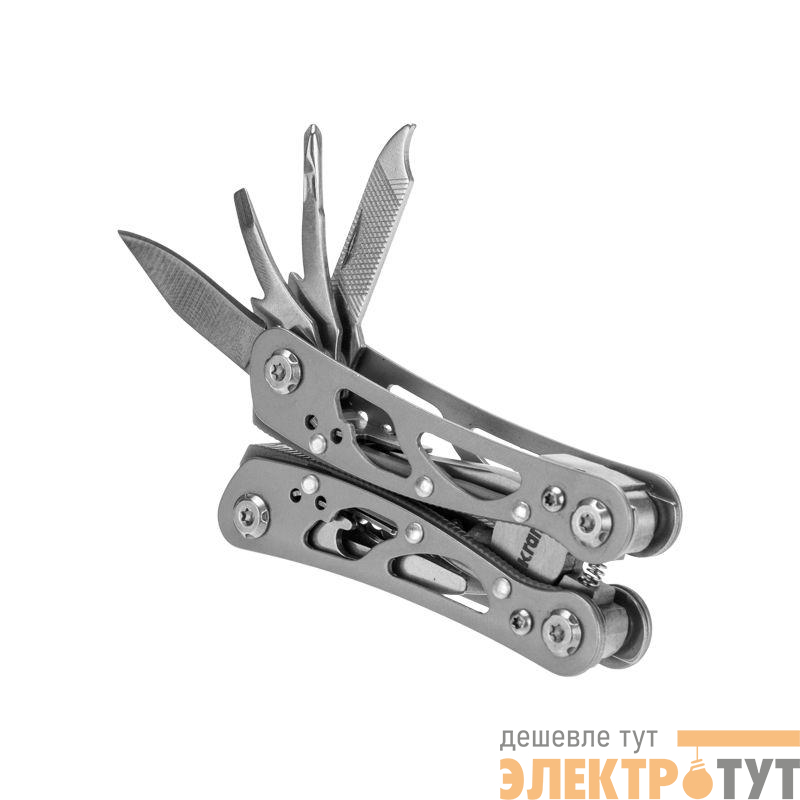 Он выполняет сразу 10 полезных в быту и на отдыхе функций: плоскогубцы, кусачки, нож, отвертка шлицевая SL2, отвертка шлицевая SL3, отвертка крестовая PH1, пилка для ногтей, открывалка для бутылок с отверткой шлицевой SL4, нож с зазубринами и консервный нож.